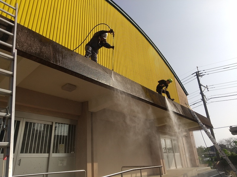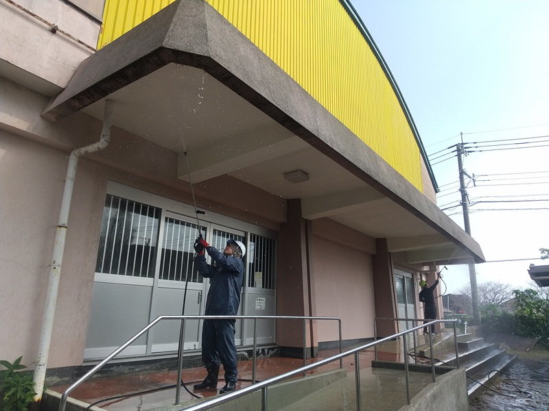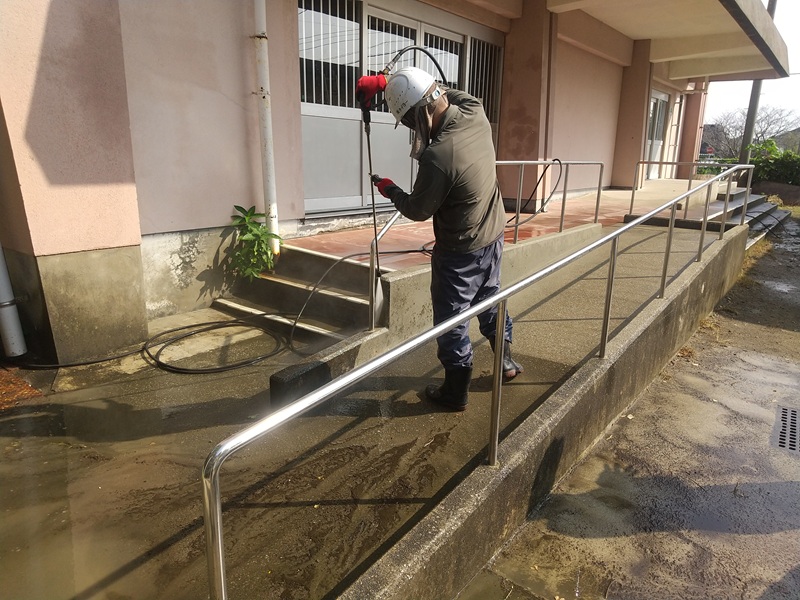 普段清掃ができない屋根の上や、高圧洗浄機でないととれない廊下のこびりついた汚れも、運動会前の秋休み期間中にキレイに。