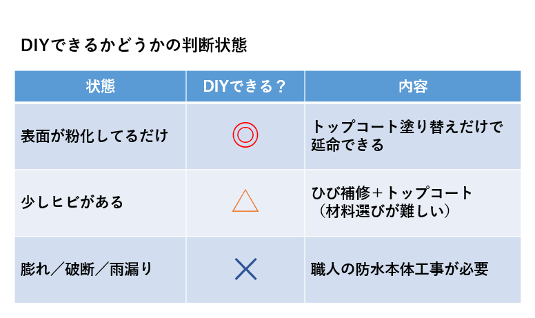 DIYが完全にダメと言ってる訳ではありませんが、DIYでの施工は“元気な防水層”の時だけの延命策で、すでに防水が健全な場所の延命には価値があります。ただし「ひび割れ」「フカフカ」「膨れ」が出ている場合は、トップコートを何度塗ってもコストを回収できません。プロに任せたほうがお得になる領域だということを頭の隅に入れておいておくとよいかと思います。