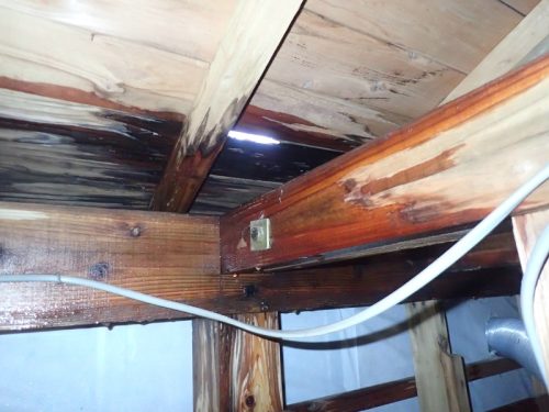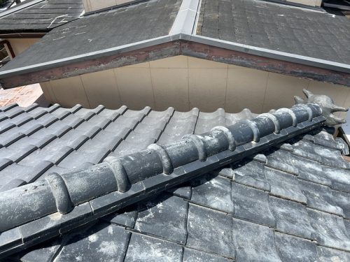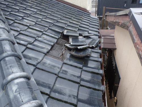 飛来物によって瓦屋根が破損した形跡があり、下地も雨漏りによって劣化している状態でしたので、速やかに応急処置を行い、火災保険申請に必要な写真書類作成、お見積りのお手伝いから工事をすすめました。